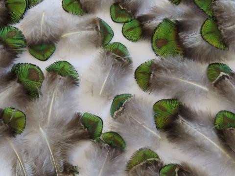 The colour changes depending on the viewing angle; graduating from a deep gold to a deep green. They come from a mature peacock.