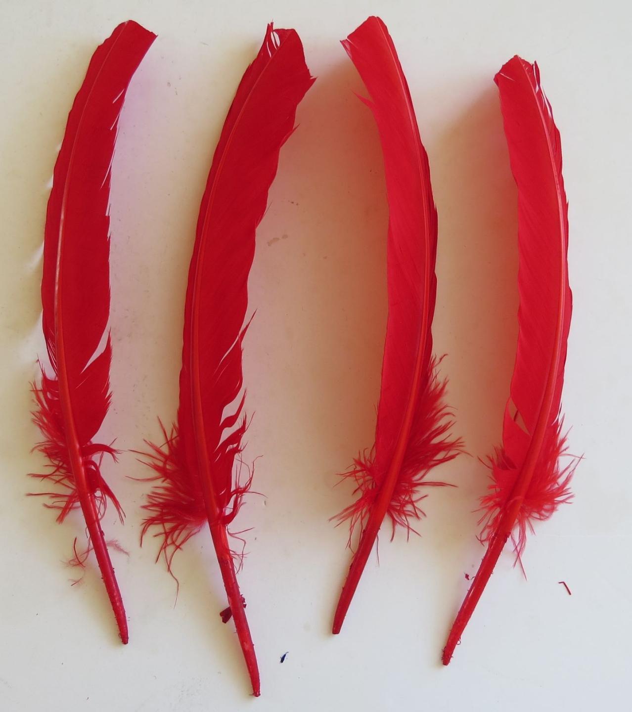 Here are some red quill feathers for kapa haka and crafts. Approximate length: 25 - 30 cm Species: Turkey Price NZ$20.00 Feathers in Pack 10 50 Quantity