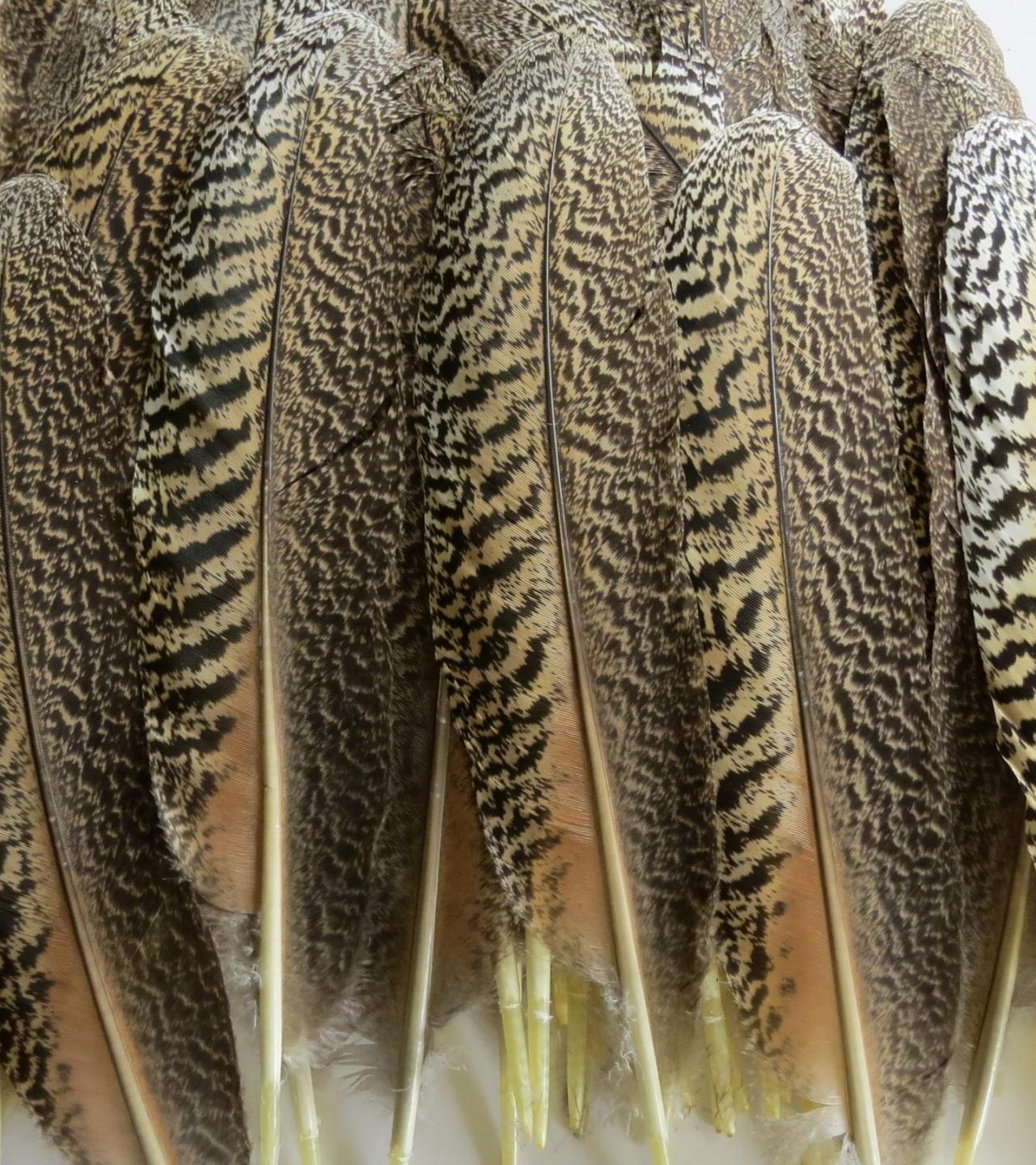 Previous Pause Next These striped quills are a popular item. Approximate length: 30 - 35 cm Species: Male Peafowl Price NZ$20.00 Feathers in Pack 10 50 100 Quantity