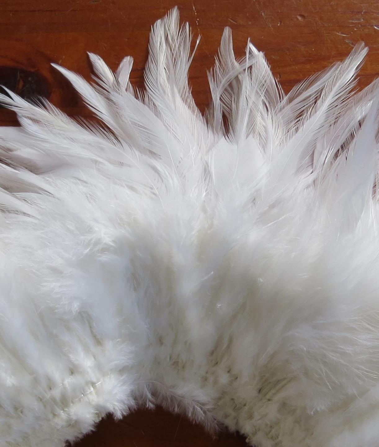 Previous Pause Next These natural white saddle feathers also come as a banded product. Approximate length: 10 - 15 cm Species: Rooster (chicken) Price NZ$35.00 Strings 1 m Quantity
