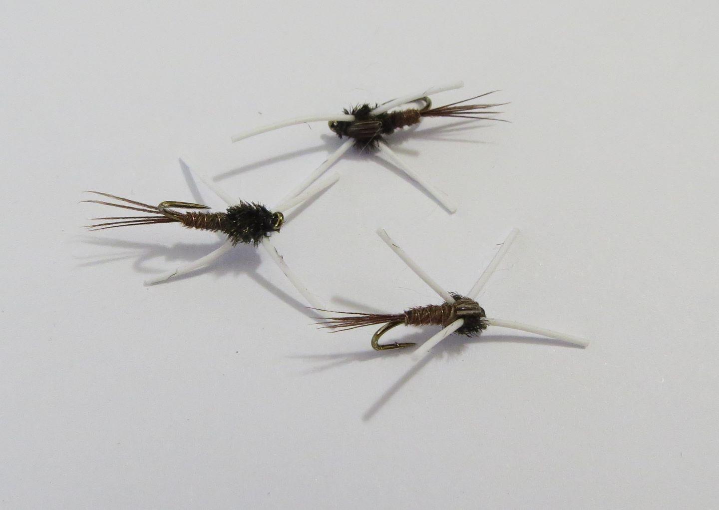 This is the same bead head pheasant tail nymph with rubber legs just without the bead. It will sit in the surface film nicely like an emerger. Try one on its own or behind a dry fly and see what happens