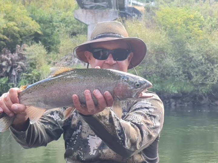 The lake was the lowest we have seen this season. It was at least one metre lower than it had been all summer. We worked our way down and fished a lot of country before Dan finally caught a great rainbow on a bead head grey woolly bugger. It was then my turn. I tied on a length of 10 pound fluoro with a cone head grey woolly bugger. It took a while and a lot of casts before I got mine.